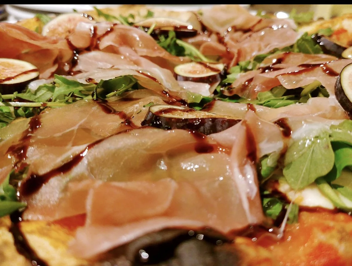Fresh figs, Ontario procuitto, buffalo mozzarella arugula with a tomato sauce base, drizzled with a balsamic and honey glaze