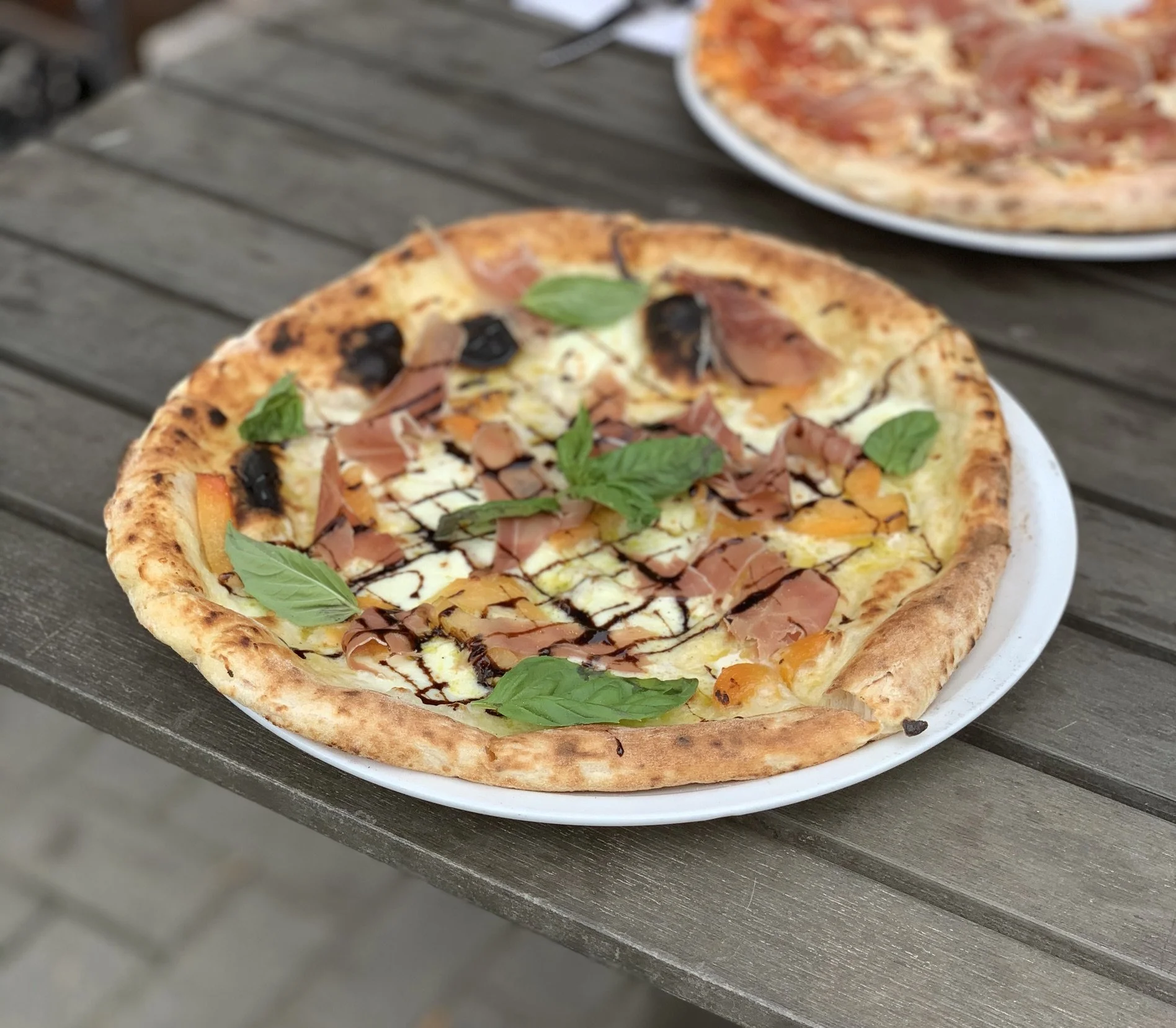 Buffalo mozzarella, oven roasted peaches and Ontario prosciutto with a drizzle of balsamic glaze. This white pizza is light and bursting with flavour