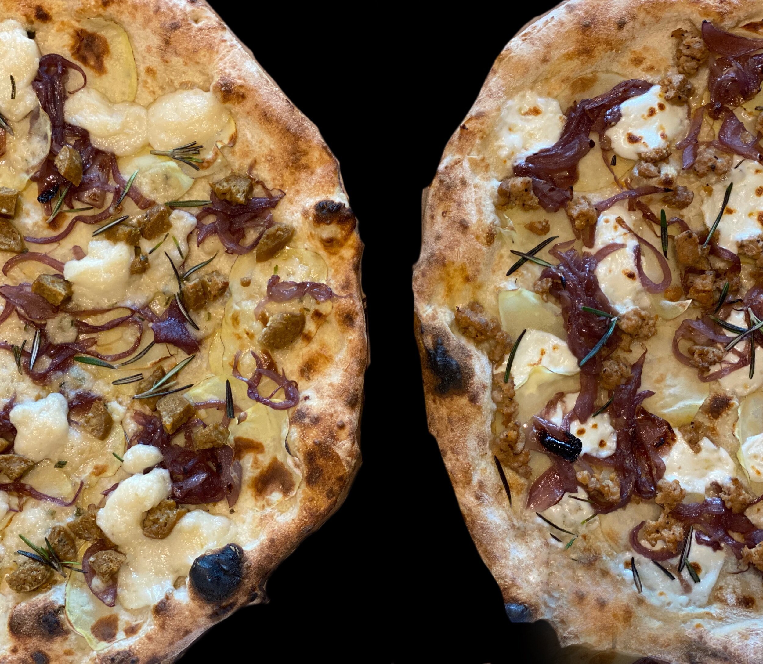 One pizza, two preferences.... Sausage, sliced potato, mozzarella cheese and caramelized onion. The difference.... one is Vegan and one is not, you choose! For the month of May they are both the same price. Both are available in a 12” or 16” size
