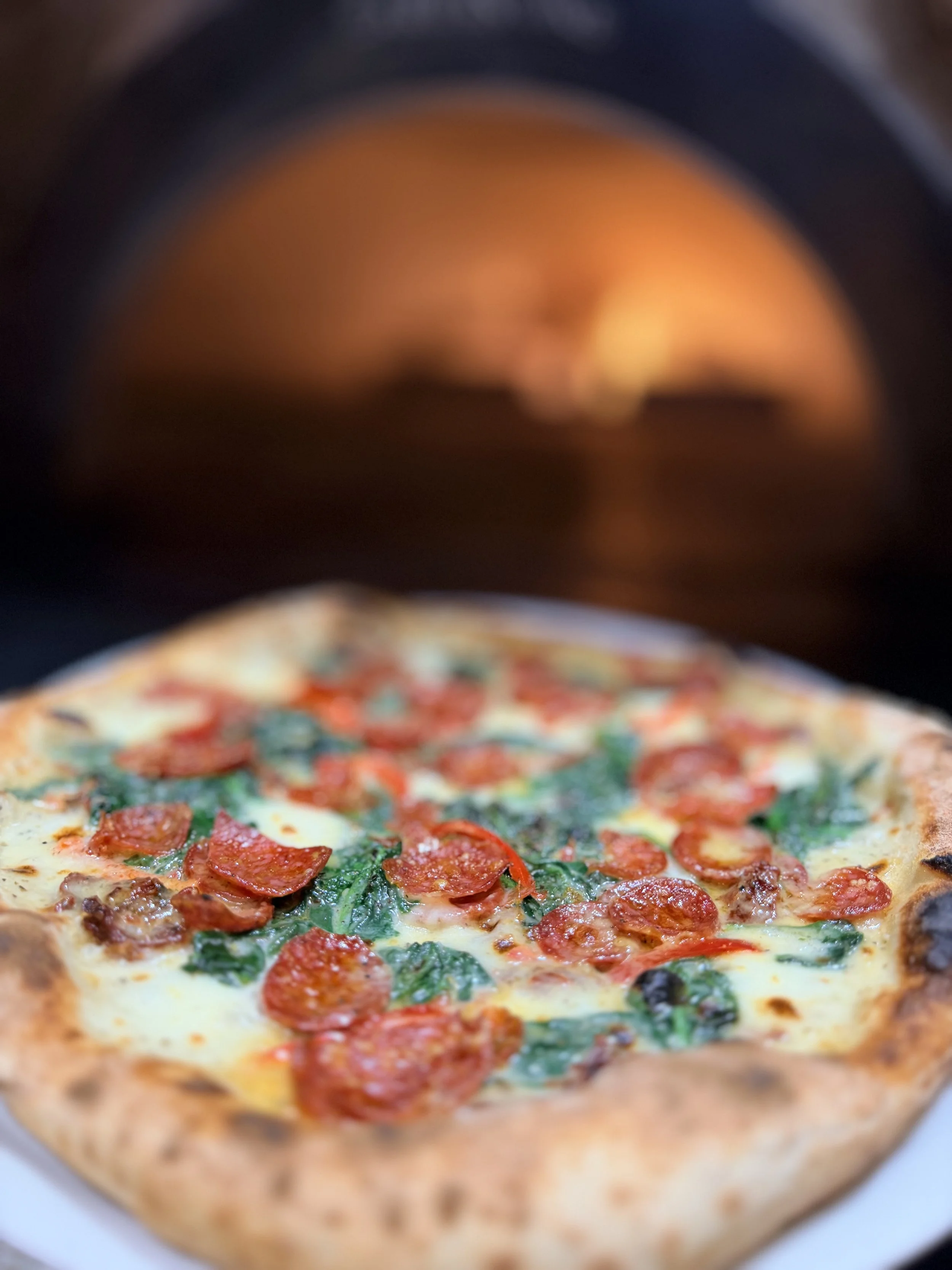 A rich garlic cream base loaded with A rich garlic cream base loaded with melty fior di latte, earthy spinach, and sweet sundried tomatoes - topped with pepperoni and cherry hot peppers for kick, then finished with aged parm..