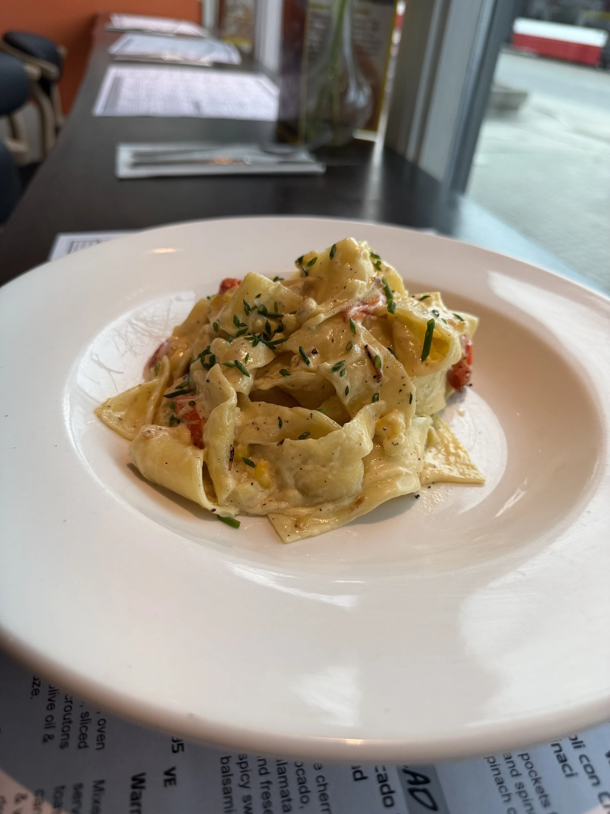 Wide ribbons of pappardelle tossed in golden shallot butter with sweet corn and smoky roasted red peppers. Finished with shaved parm and a crack of black pepper — simple, seasonal, and seriously satisfying.