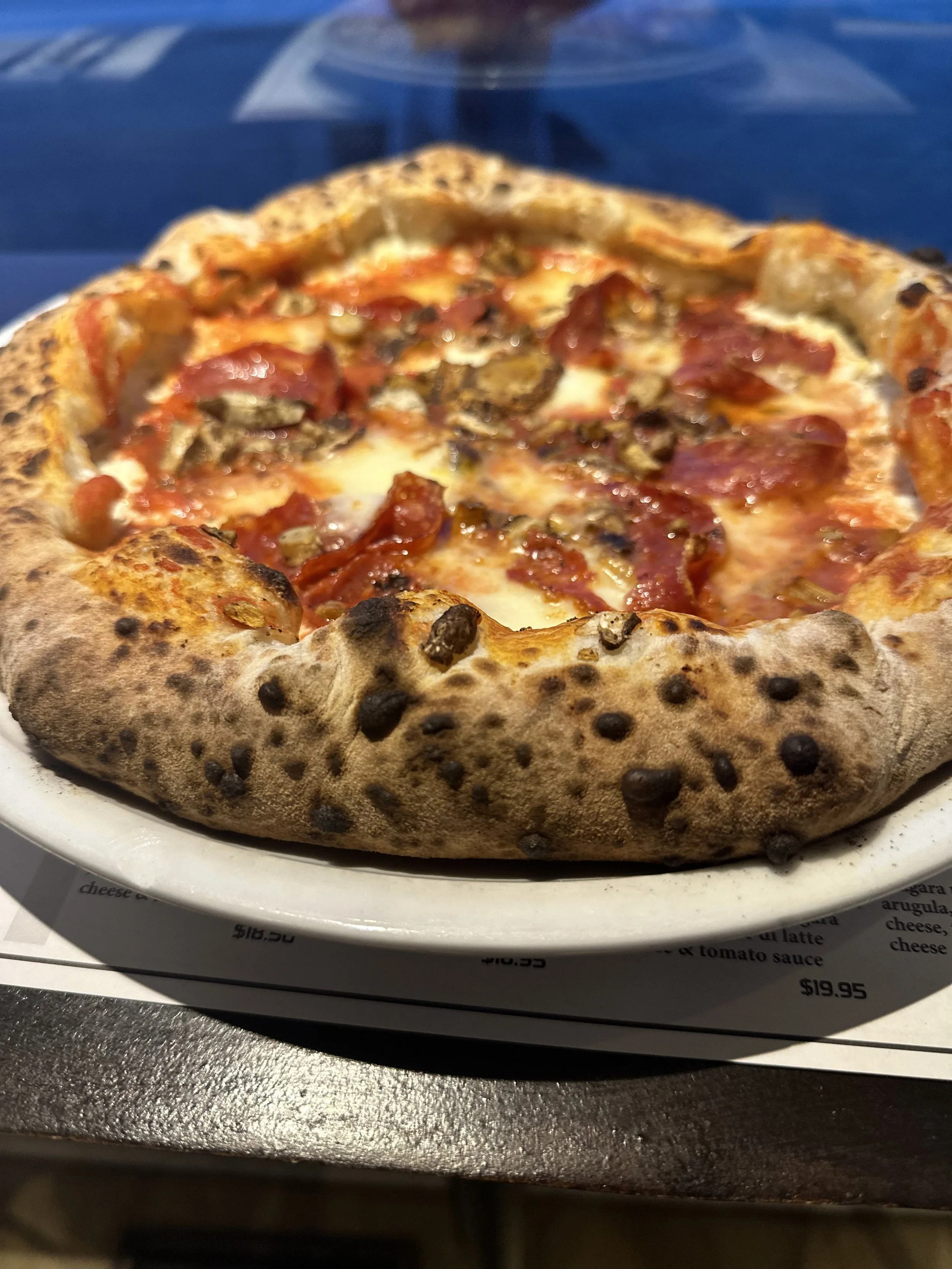 Hot Salami, Tomato sauce, Fior di Latte, Wild mushrooms with a ricotta cheese stuffed crust.
