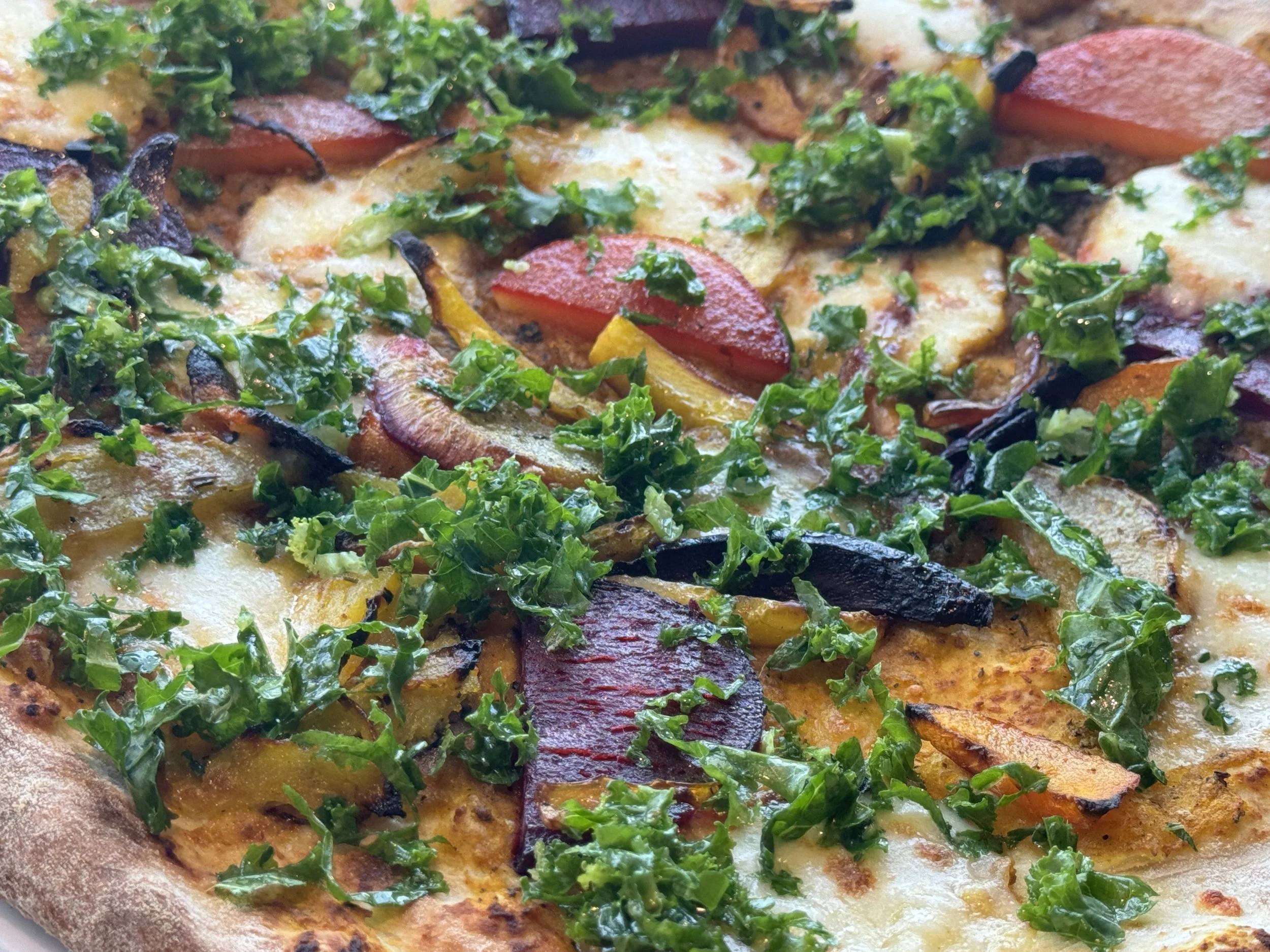 A base of roasted puréed squash with oven roasted autumn vegetables, mozzarella cheese, baby kale and spicy honey