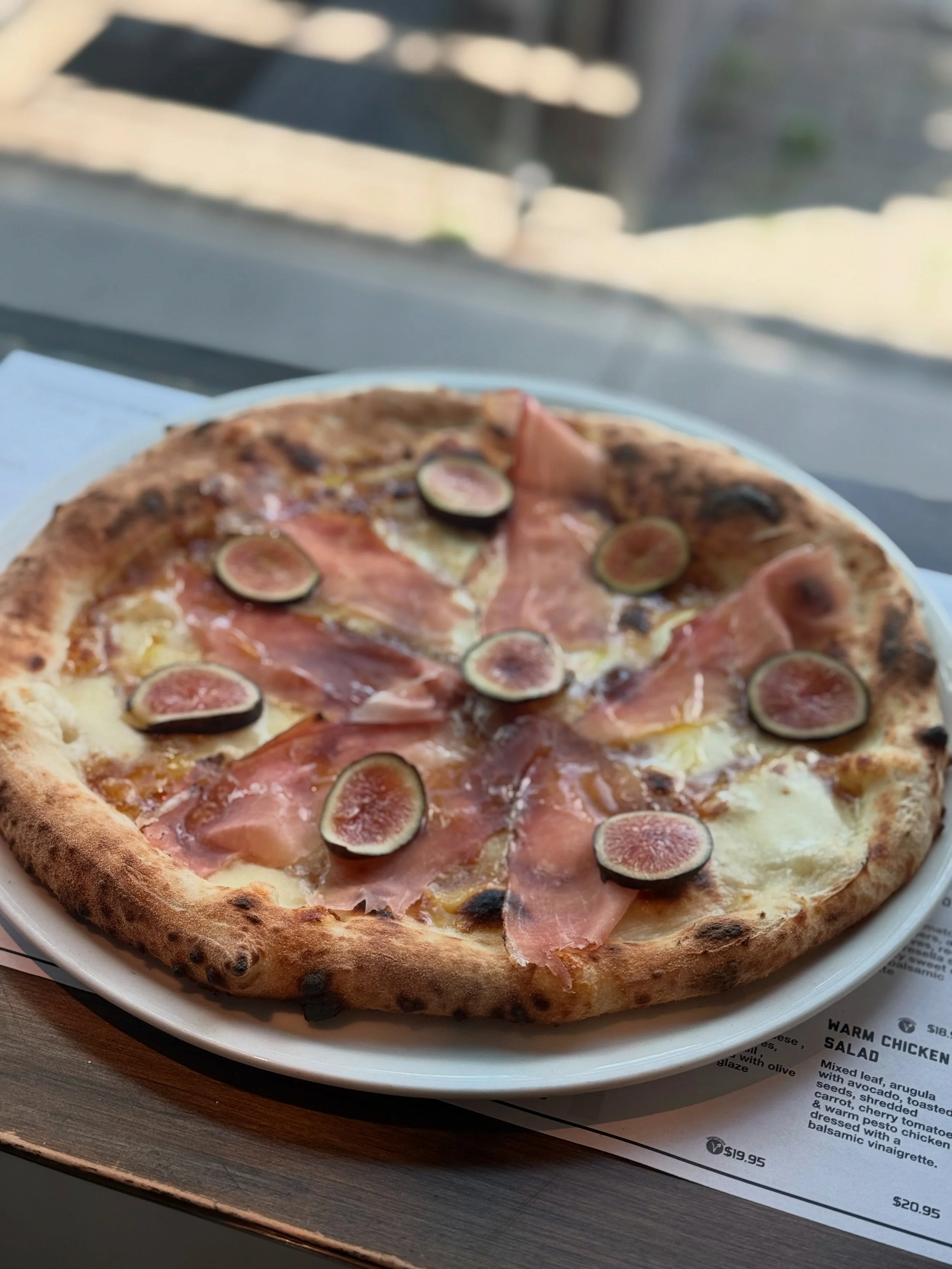 July’s Pizza is a little sweet and spicy, with a base of fig compote, chilli flakes, Ontario mozzarella cheese, amazing speck and dressed with some fresh figs on top.